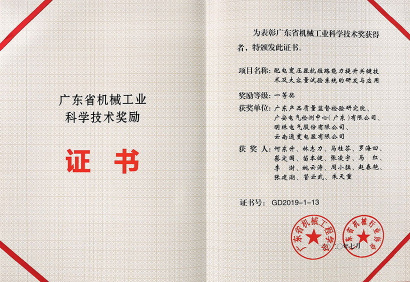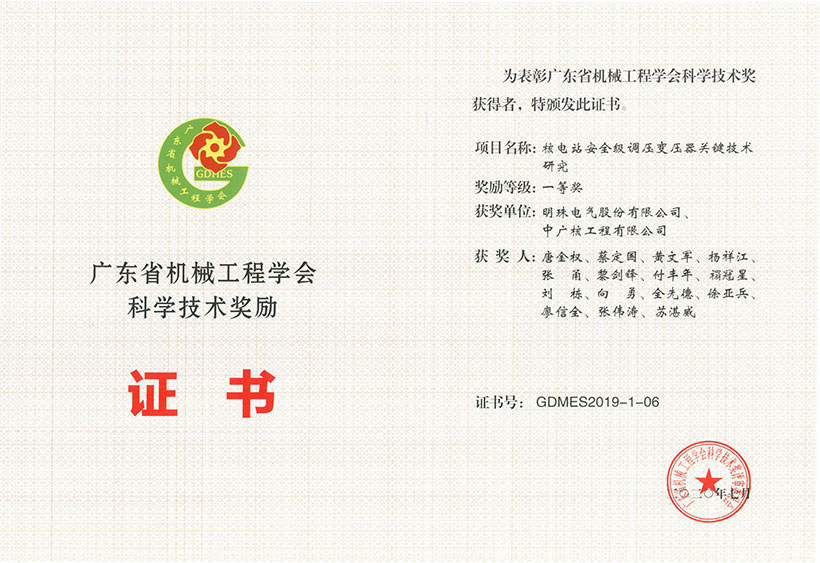 近日,明珠電氣“核電站安全級調壓變壓器關鍵技術研究”項目(與中廣核工程有限公司聯合開展)以及“配電變壓器抗短路能力提升關鍵技術及大容量試驗系統的研發與應用”項目(由廣東產品質量監督檢驗研究院主持),同時榮獲2019年度廣東省機械工業科學技術獎勵一等獎和2019年度廣東省機械工程學會科學技術獎勵一等獎。