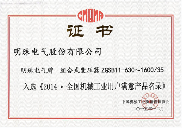 2015年12月22日,中國機械質量管理協會召開會議,對百項全國機械工業用戶滿意產品獲獎單位予以授獎,我公司組合式變壓器產品作為電工電器制造行業唯一同類產品獲授“全國工業機械用戶滿意產品”。